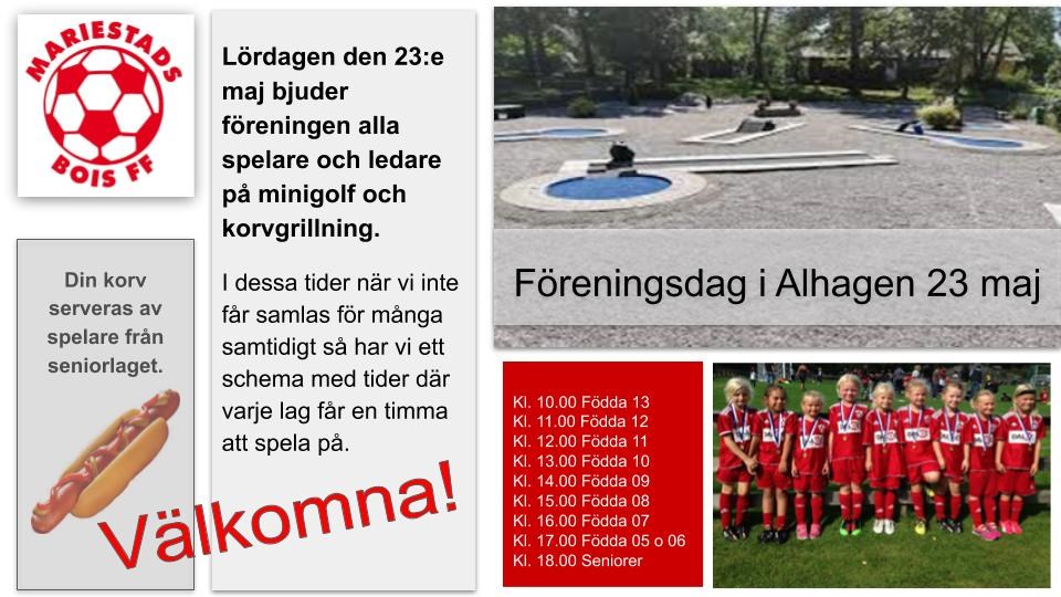 Tack alla som kom till vår föreningsdag igår. Vilken omväxlande dag vi fick vädermässigt. Vi testade alla väderslag, mulet, småkallt, soligt, regn, åska och hagel. Dagen startade med drygt 20 tjejer från vårt yngsta lag och sedan bytte vi åldersgrupp varje timma. Minigolfspelande samt grillad korv stod på programmet. Stort tack till Sofia och Henrik som ställt fram en hoppborg åt oss! De som drog nitlotten igår var våra tjejer födda 07 som hade timman kl.16.00-17.00 under värsta åskvädret. Tur att ni fick korv i alla fall. Tillsammans med grillarna Ellen, Malva och Agnes hade ni värsta passet. I går så gick en rätt så trött, väldigt blöt men också otroligt nöjd ordförande hem i regnet. Tack alla härliga BoiS-are för er insats. Korv i hagelskur F12-ledare in action Korvgrillande seniorer Hoppborg Unga BoIS-are