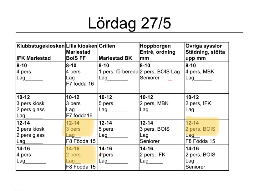 Hej! Vi behöver hjälp av er föräldrar att täcka upp på klassfotbollen. Det gäller de tiderna som är gulmarkerade på bilden. Det är under samma dag som årskurs 1 spelar. Hör av er till oss om ni har möjlighet att hjälpa till under dagen, annars får vi utse några. Mvh ledarna F11 födda 15 14 apr 2023 7kommentarer
