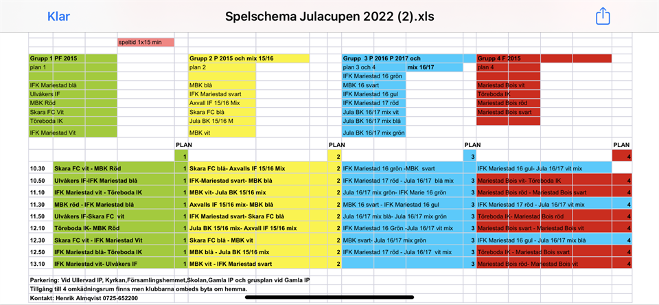 Hej! Nu har vi fått spelprogrammet för lördag 3 september. Jula-cupen Plan 4 10:50 Bois vit - Töreboda ik 11:10 Bois röd - Bois svart 11:50 Töreboda ik - Bois röd 12:10 Bois svart - Bois vit 12:50 Töreboda - Bois svart 13:10 Bois röd - Bois vit Vi återkommer med vilka tjejer som spelar i vilket lag Hälsningar ledarna F11 födda 15 29 aug 2022 2kommentarer