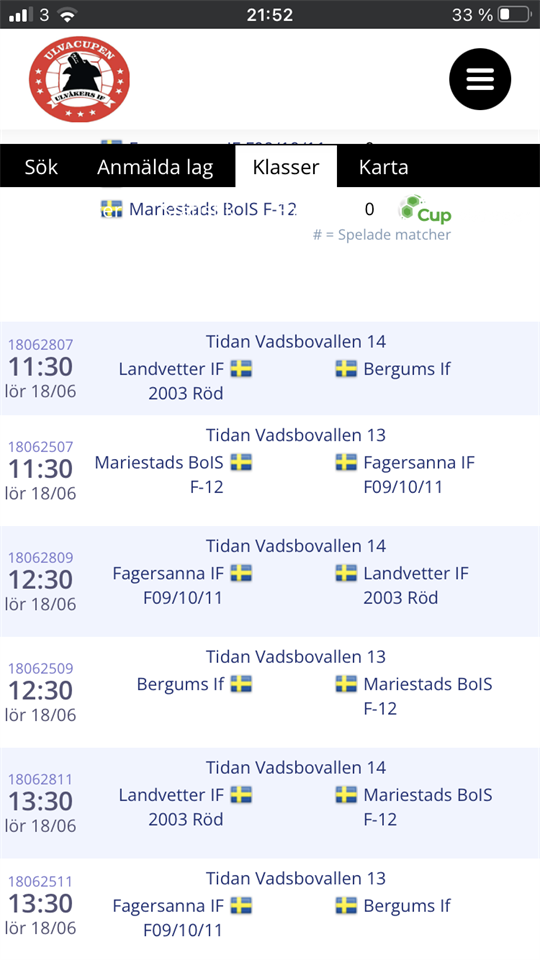 Lördagen den 18 juni och söndagen den 19 juni är det dags för Ulvacupen. Det är tre matcher på lördagen och tre matcher på söndagen. Beroende på resultat under lördagen lottas man in i en ny grupp med nya lag på söndagen. Därför vet vi inte vilka tider vi spelar på söndagen förrän gruppspelet är klart på lördagen. På lördagen spelar vi i Tidan på Vadsbovallen med första match 11.30. Alla tjejer som kan vara med under helgen är med och spelar. Anmälan till cupen innebär spel både lördag och söndag. I bifogat dokument kan ni se tider för matcherna på lördagen. Vi återkommer med anmälan, samlingstid och information efter helgen. Mvh Ledarna