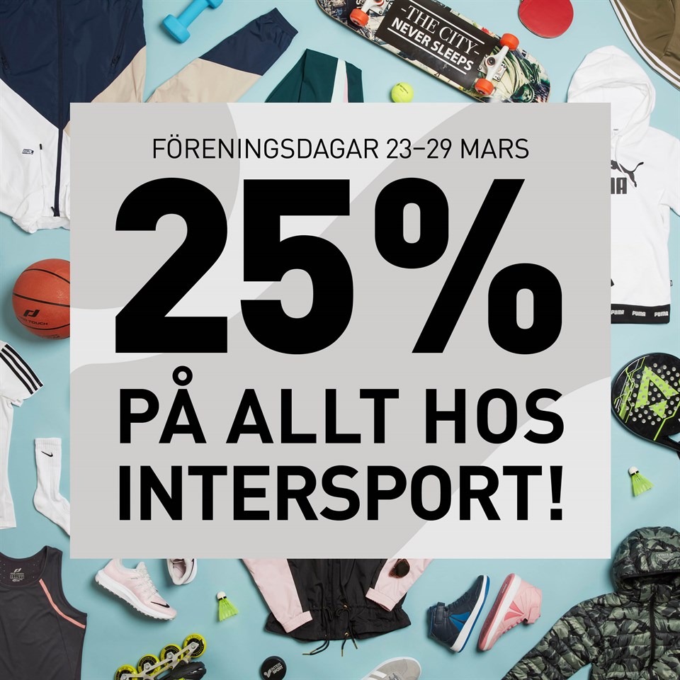 Exklusivt erbjudande till alla våra medlemmar! Den 23–29 mars önskar vi alla medlemmar välkomna på exklusiva föreningsdagar hos vår samarbetsparter INTERSPORT! Som medlem får du 25% rabatt på allt i butiken*. Passa på att inhandla vårens senaste sportmode och allt för en ny härlig idrottssäsong. Ta med den här inbjudan till någon av våra butiker eller visa upp den i din smartphone i kassan för att erhålla rabatten. Du kan också använda rabattkoden FORENING25 på intersport.se. Välkommen till din närmsta Intersportbutik eller intersport.se! *Erbjudandet gäller 23–29 mars på ord.pris, dock ej på cykel, presentkort, elektronik, föreningskläder/teamkläder eller beställningsvaror.